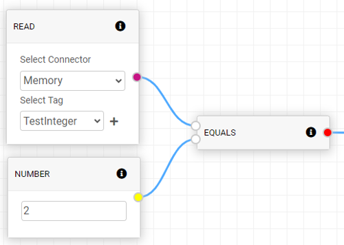 EQUALS will compare 2 inputs of the same data type (a number with a number, a string with a string) and output a true bit if they are the same or a false if they are not.