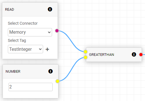 GREATERTHAN command will compare NUMBER data types and check if the first input is a higher number than the second input and output true, if it is equal to or less than the second number it will output false.