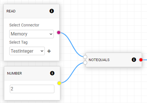 NOTEQUALS will compare 2 inputs of the same data type (a number with a number, a string with a string) and output a true bit if they are the different or a false if they are the same.
