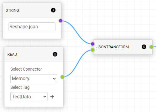 JSONTRANSFORM will transform a JSON Data type by referencing a json transform file name from input 1 and applying it to input 2's Data type input.