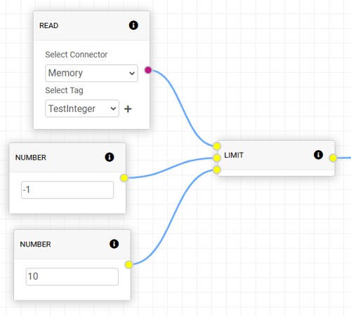 LIMIT will define the lowest and highest number an output can be. Input 1 will be the number that needs limiting, if it is lower than input 2, input 2's number will be the output, if it is higher than input 3, input 3's number will be the output.