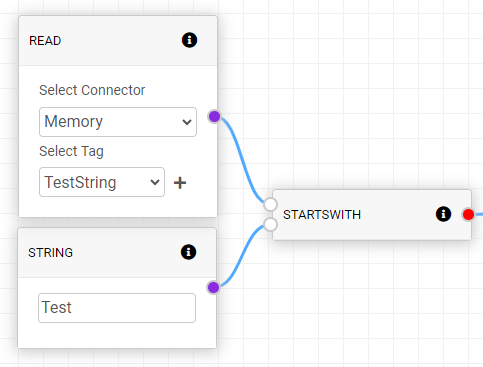 STARTSWITH command will test if a string in input 1 starts with the characters input from the input 2. It will output true if the input 2 matches with the start of input 1 otherwise it will output false.