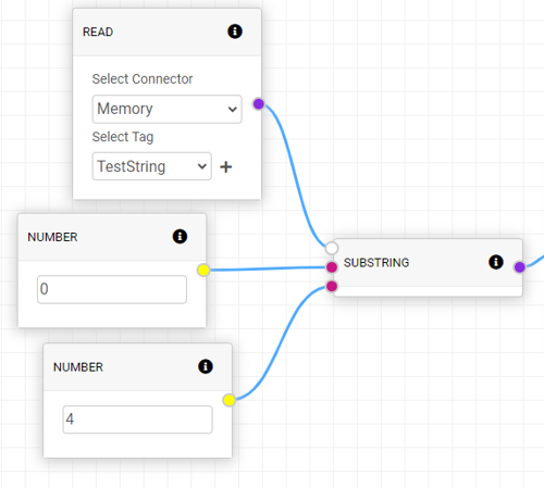 SUBSTRING will have a string input for input 1 and will output a subsection of the string indicated from starting position from input 2, which is an integer, and take the next number of characters defined by input 3.