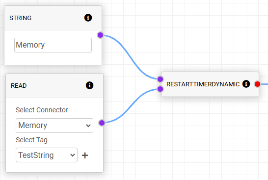 RESTARTTIMER will reset the timer to 0 and start the timer. The connector name and tag name are set by input 1 and 2 respectively.