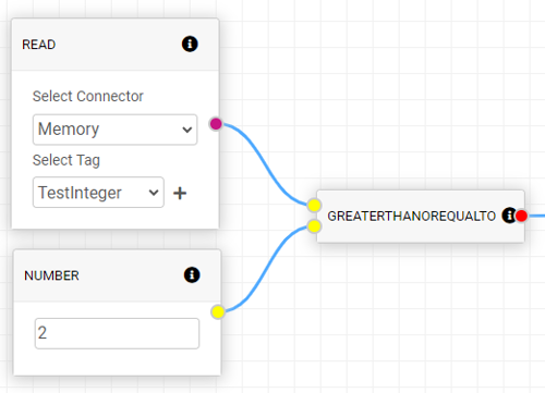 GREATERTHANOREQUALTO command will compare NUMBER data types and check if the first input is a higher or equal number than the second input and output true, if it is less than the second number it will output false.
