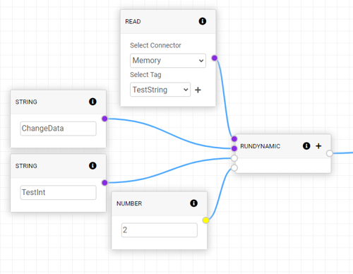 RUNDYNAMIC works in a similar way to RUN however the method name and the connector name can be input dynamically from another tag, knowledge of the run method you wish to launch will be required from connector wiki's, and arguments will need to be added manually using the + symbol of RUNDYNAMIC.