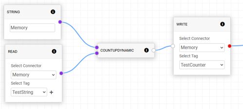 COUNTUP will step a Counter tag's value up by it's defined step size and output the value. The connector name and tag name for the Counter tag is defined by inputs 1 and 2 respectively.