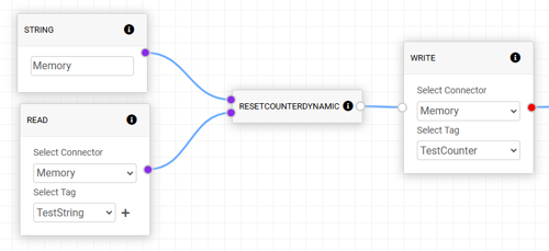 RESETCOUNTER will set a Counter tag's value to 0 and output the 0. The connector name and tag name for the Counter tag are defined by inputs 1 and 2 resepctively.